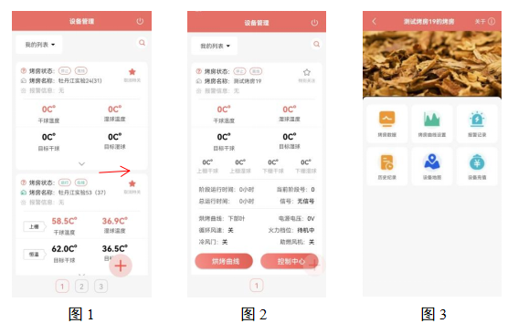 進(jìn)入APP后會(huì)出現(xiàn)圖1所示的界面,能夠看到烤房當(dāng)前的各參數(shù)數(shù)值;能對(duì)已綁定烤房進(jìn)行特別關(guān)注操作; 點(diǎn)擊下箭頭會(huì)出現(xiàn)烤房更詳細(xì)的當(dāng)前狀態(tài)信息,點(diǎn)擊“烘烤曲線(xiàn)”選項(xiàng)能夠查看此烤房各項(xiàng)指標(biāo)隨時(shí)間的變化的曲線(xiàn); 點(diǎn)擊“控制中心”選項(xiàng)后會(huì)顯示圖3所示控制中心界面。