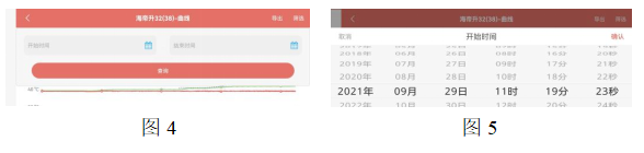 點(diǎn)擊圖3中的“歷史記錄”可以查看此烤房在之前烘烤時(shí)各部分的數(shù)值,也可以點(diǎn)擊歷史記錄界面中右上角的“導(dǎo)出”選項(xiàng)對(duì)歷史數(shù)據(jù)進(jìn)行導(dǎo)出。篩選某時(shí)間段的曲線(xiàn), 點(diǎn)擊歷史記錄界面右上角的“篩選”選項(xiàng),會(huì)出現(xiàn)圖4所示的彈窗,點(diǎn)擊圖標(biāo),會(huì)出現(xiàn)圖5所示選擇時(shí)間的彈窗, 選擇所要觀(guān)察的時(shí)間段的開(kāi)始時(shí)間和結(jié)束時(shí)間后,點(diǎn)擊查詢(xún),即可查看選擇時(shí)間段內(nèi)的烘烤曲線(xiàn)。