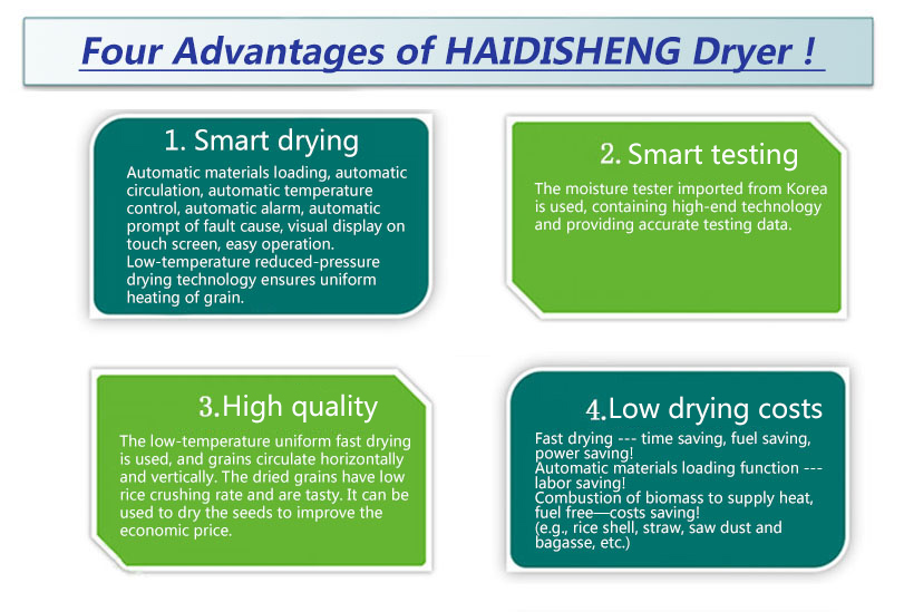 The grain dryer developed by LIAONING HIDEAR SHENG MACHINERY CO., LTD with efforts for years can dry multiple corns, including rice, corn, barley and wheat. The dryer adopts advanced technology, has high automation, is easy to operation, has reliable performance, small noise, weak vibration, short drying duration, and saves the fuel and energy remarkably. The practice has proved that, it can save energy by about 20-25% compared with other equipment with the same drying capacity.